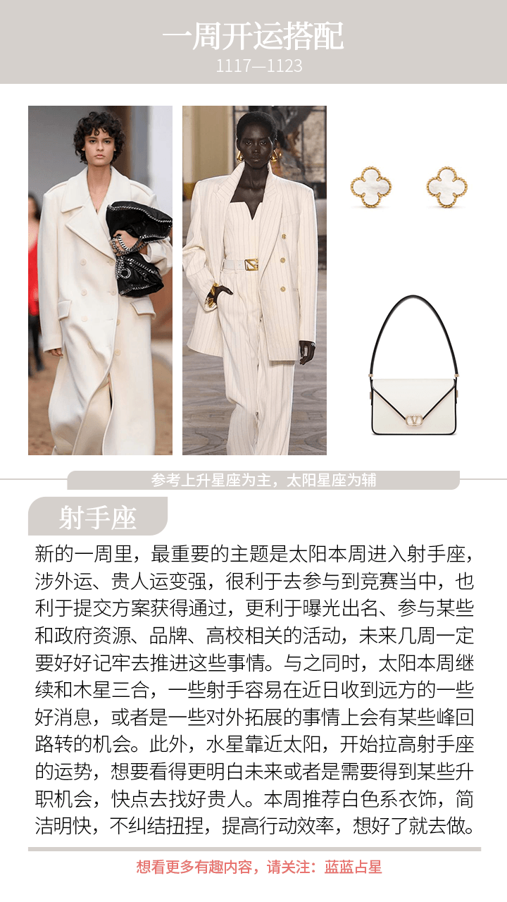 另外,本周太阳回到弓手座,弓手们期待的好音讯要来了——太阳动作弓手君的一等贵气星,它的到来将带来极强的贵东说念主力量,异日四周大利磨砺、升职、涉外、旅游、传播、践诺、放洋、涉足政府/互联网/高校/生意资源等。生辰惬心,大弓手!
